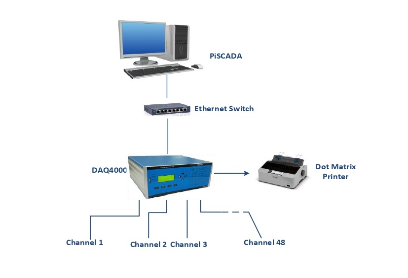 DAQ4000 is a 48 Channel data logger. Data can be transfered to PiSCADA over Ethernet. The data logger along with the PiSCADA system adheres to all the requirements of 21CFR Part 11. Printer output and USB are also available for Data transfer. All the required configurations can be programmed from the PiSCADA system.